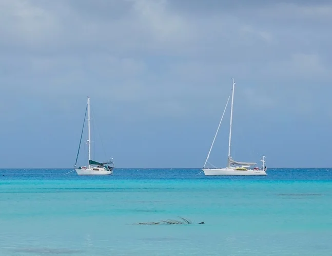 Here are our boats viewed from shore in Toau. Note the whitecaps behind us and the fully extended anchor chains indicating windy conditions. That is Mike and Katie’s Pangea on the left and our Itajime on the right.