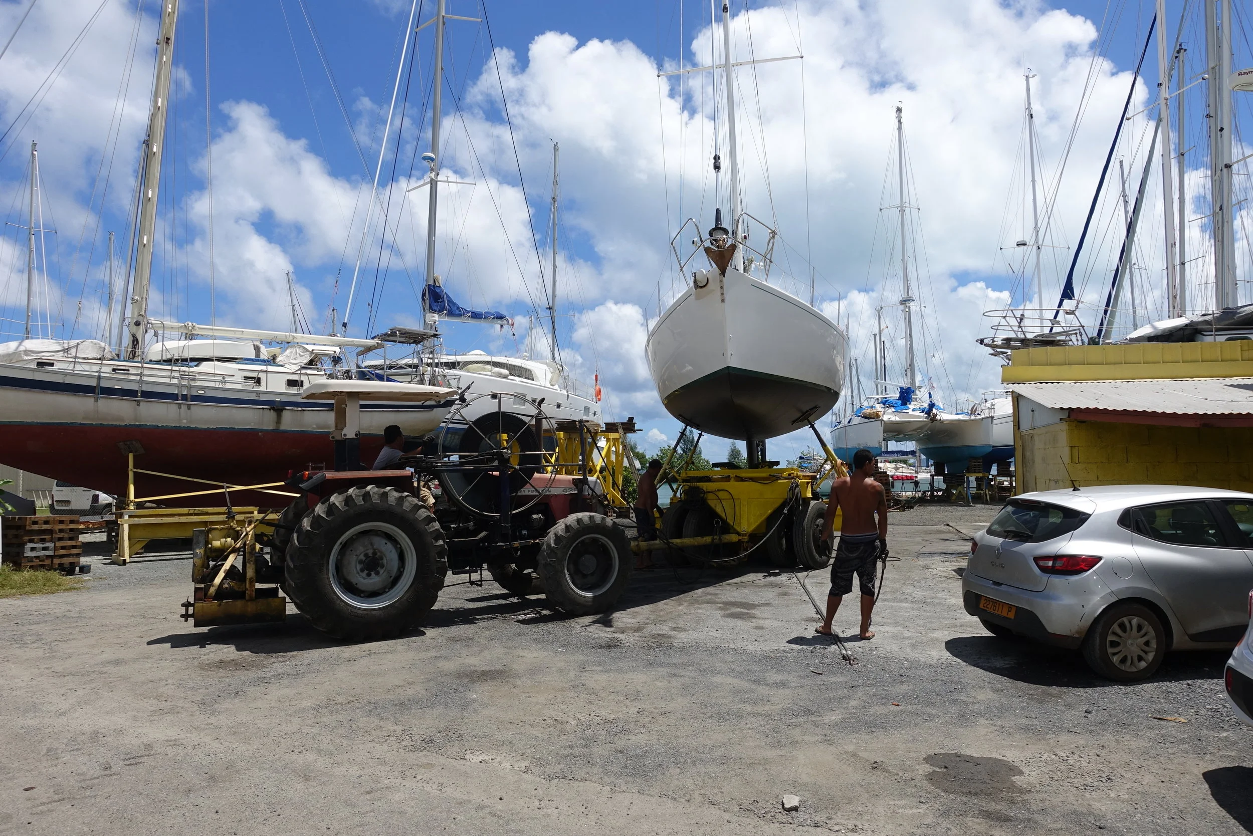 At 2 PM this afternoon (High Tide), The men at Chantier Naval des Ilse Sous Les Vent fired up the farm tractor and backed Itajime back into the sea!